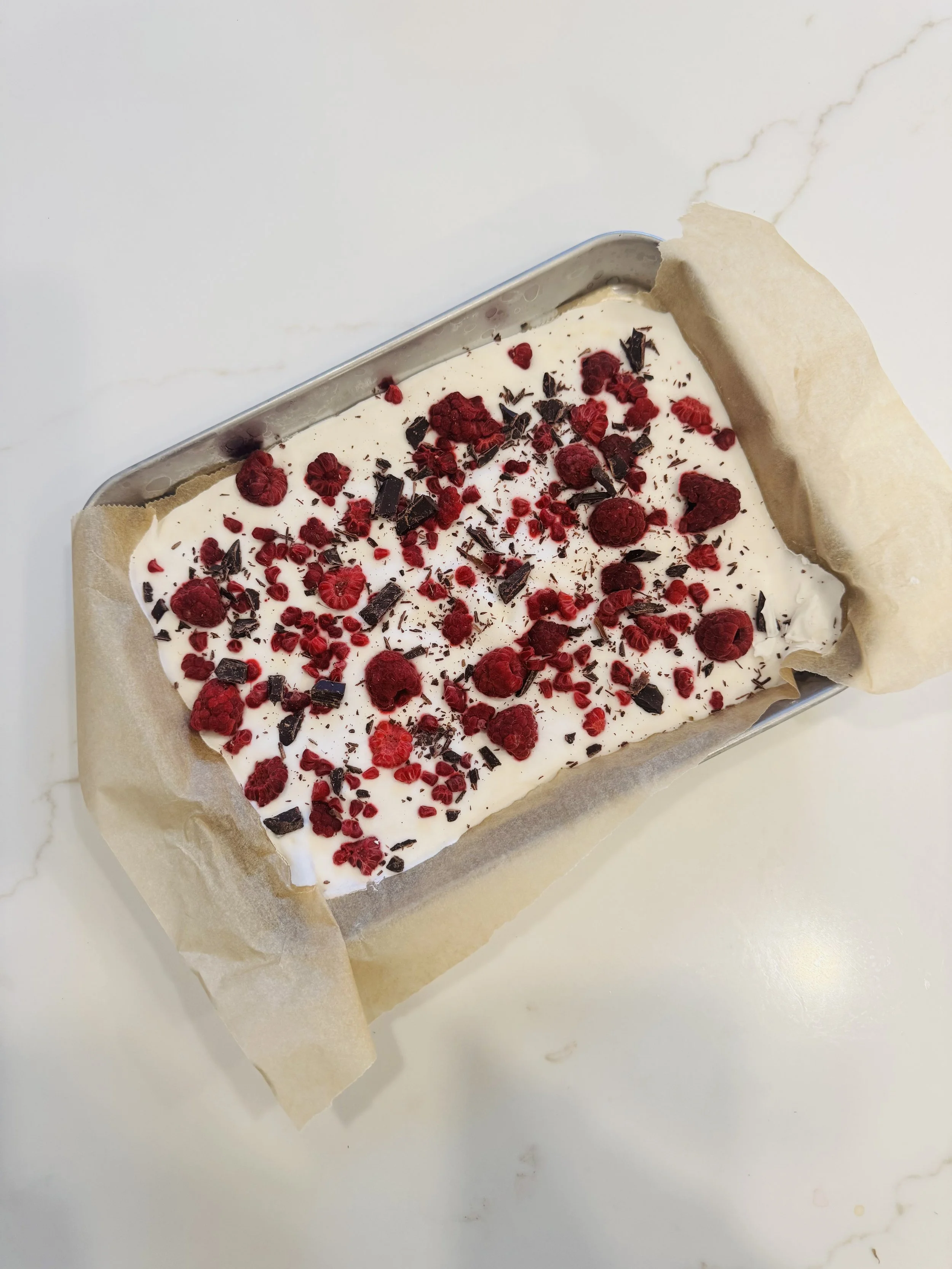 Sprinkle the frozen raspberries and chocolate over the top of the mixture and evenly distribute